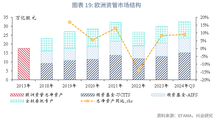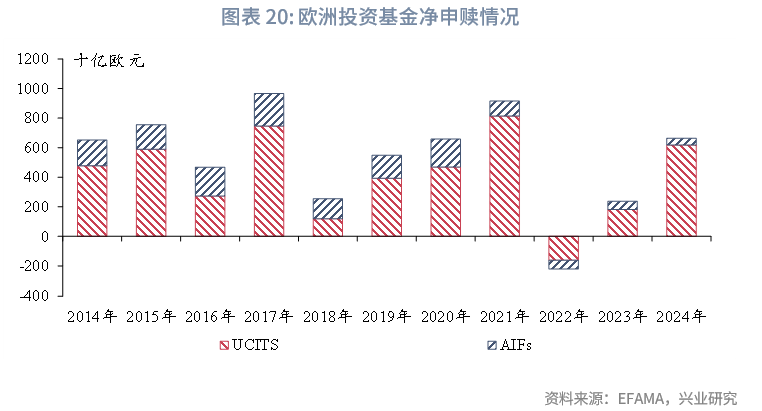 投资基金是欧洲资管规模增长的主要驱动力。2024年年末,投资基金(Investment Funds)占比约71.6%,规模较2023年年末同比增长13.2%;全权委托专户(Discretionary Mandates)占比约28.4%,规模与2023年年末基本持平。投资基金中,欧盟可转让证券集合投资计划(UCITS)和另类投资基金(AIFs)占比分别为65.1%和34.9%。