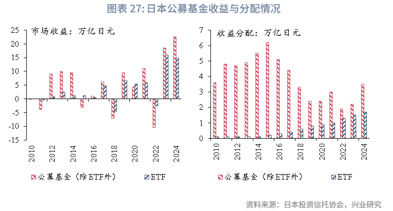 日本公募基金的净申购规模与股市表现呈现一定正相关性。当日本和全球股票市场涨势较好时,公募基金的申购规模往往较高;股市遭遇回撤调整时,公募基金的申购规模较低,甚至出现净赎回。从市场收益来看,除ETF外的其他公募基金的收益波动远大于ETF,收益空间和回撤幅度均更高;从收益分配来看,除ETF外的其他公募基金分配规模高于ETF,但已较十年前显著下滑,ETF在过去十年间的分配水平则逐步提升,也提高了ETF的相对吸引力。