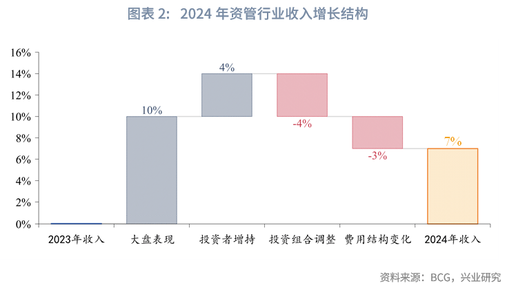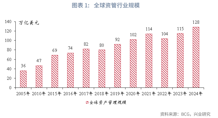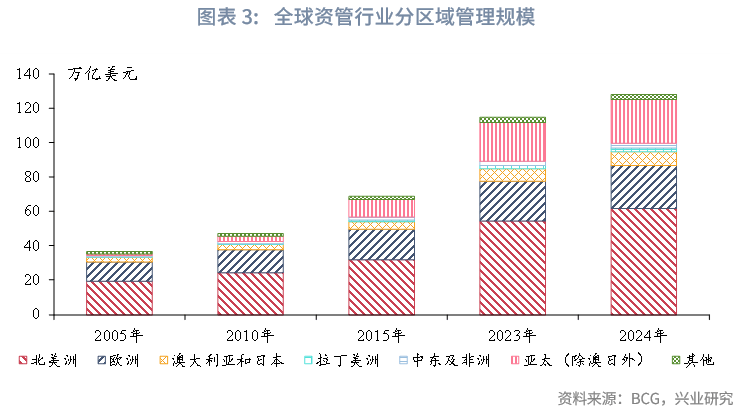 全球资产管理资产规模(AUM)再创新高。根据BCG报告显示,2024年,全球资产管理规模达到创纪录的128万亿美元,较2023年同比增长12%,标志着行业已从低迷的2022年反弹,但复苏背后隐藏着日益加剧的结构性压力。2024年,全球资管行业580亿美元的收入增长中,超过70%是由市场大盘上涨贡献的而不是投资者资金流入推动的,体现了行业易受外部因素影响的脆弱性。全球资管行业正面临的投资者偏好转变、数字化进程加速以及管理运营费用压缩等关键挑战,都迫使管理人重新考虑业务发展模式。