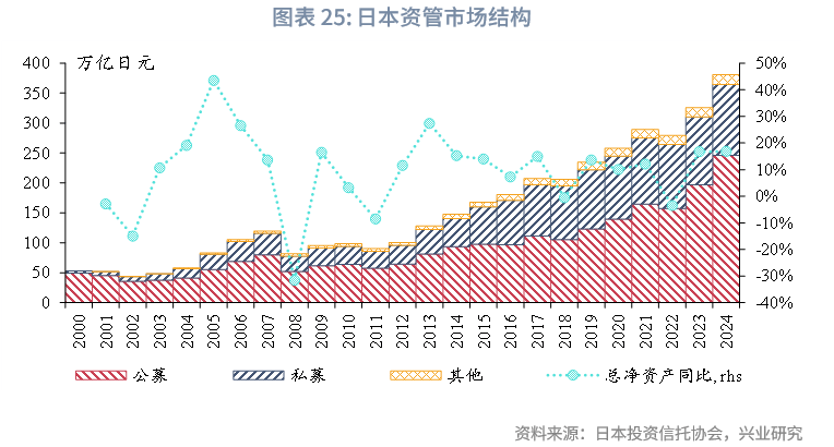 2024年,日本资管规模以380.7万亿日元创下历史新高,同比增长16.3%,增速高于美国和欧洲的水平。其中,公募基金占比在过去五年中持续扩大,从2019年的51.0%扩张到64.6%;私募基金占比相应从43.5%萎缩至31.1%。