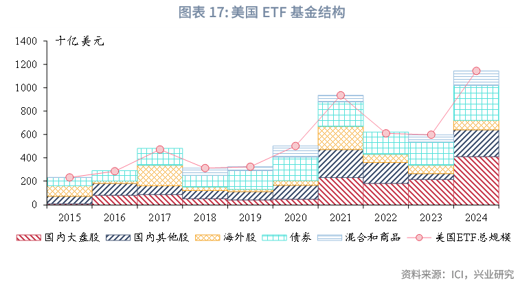 与全球资管行业趋势相似,美国权益型基金内部,被动型基金(尤其是被动型ETF)占比同样在快速扩张。2024年,美国ETF净发行量(包括再投资股息)从2023年的5970亿美元飙升至2024年的1.1万亿美元,创下历史新高。所有ETF细分类别的规模均实现增长。其中,国内大盘股ETF的净发行量从2023年的3190亿美元大幅上升至2024年的7420亿美元;海外股票ETF的净发行量从2023年的830亿美元增至2024年的970亿美元;债券ETF的需求受到X世代老龄化稳健型配置需求的推动,净发行量从2023年的2010亿美元增至2024年的2950亿美元。