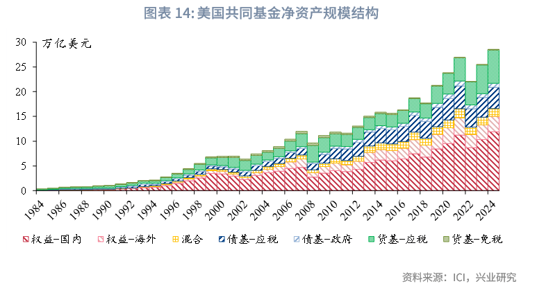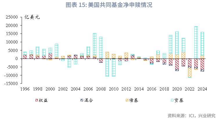 共同基金中权益型基金的规模常年保持50%以上比重。2024年年末,权益型、债券型、混合型、货币型共同基金规模分别为15.0万亿美元、5.1万亿美元、1.6万亿美元、6.8万亿美元;占比分别为52.6%、17.8%、5.6%、24.0%;规模同比分别上涨12.7%、7.0%、3.9%、15.9%。其中,权益型和混合型基金连续多年出现净赎回,近两年净资产上涨主要依赖市场投资正收益;货币基金占比在美国高息环境中连年攀升,2024年占比较2021年已上涨6.3个百分点。