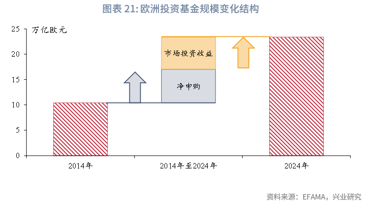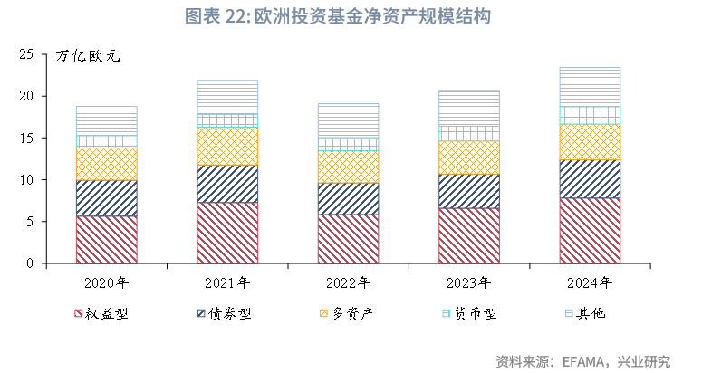 从产品结构来看,欧洲市场的风险偏好有所回暖,投资基金对权益型产品的配置规模和占比双双上涨。2024年,权益型、债券型、多资产、货币型产品规模分别为7.8、4.6、4.3、2.1万亿欧元,同比分别增长18.7%、11.6%、8.1%、18.5%。其中,权益型产品占比约33.4%,较2023年提高1.6个百分点。
