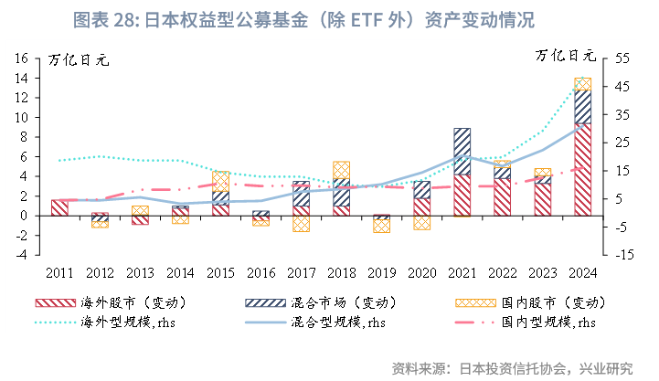 2019年是日本投资于国内和国外公募基金规模的切换节点。自2014年起,日本政府年金投资基金(GPIF)作为全球最大的养老金基金逐步增加海外资产比例,成为日本国内基金配置的风向标。日本央行维持超宽松货币政策,国内资产回报率低迷,迫使投资者转向海外寻求更高收益。机构投资者为降低本土市场集中风险,系统性提升海外配置比例。个人投资者在小额投资免税制(NISA)鼓励下,纷纷通过公募基金配置海外资产。日元融资货币特征甚至驱使许多投资者加杠杆投资海外资产。2019年,日本投资于海外股票和债券的基金规模均首超国内或混合基金。2024年,日本对海外股债的配置比例进一步加大。