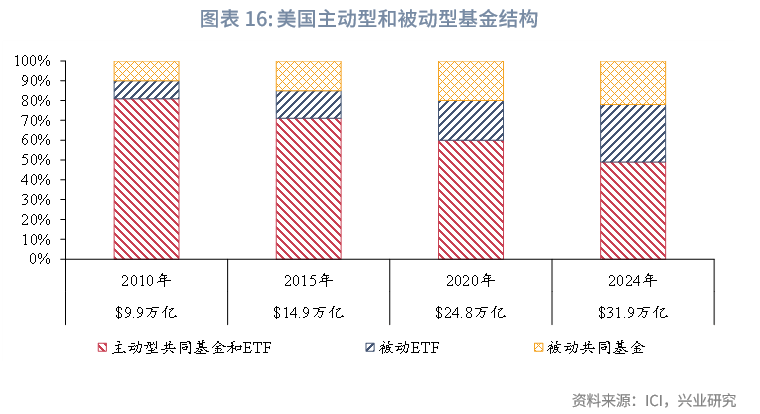 投资者延续了从主动型策略转向被动型策略的长期趋势。2024年主动管理型基金(不包括货币市场基金)净流出资金为0.1万亿美元,而被动管理型基金的流入资金为1.6万亿美元。长期以来,被动型产品的持有者主要为散户,近年机构投资者也在转向被动型产品。在过去五年中,被动型资产管理规模占比持续增长,而主动型资产管理规模占比缩减。