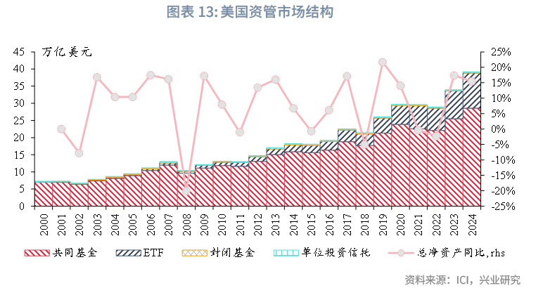 美国资管市场以共同基金为最主要产品。2024年,美国资管的主要投资产品以共同基金和ETF为主,分别占72.8%和26.3%;共同基金和ETF继续获得资金净流入,规模同比分别增加11.8%和27.5%。ETF对资金的吸引力持续增长,在过去25年间的年均同比增速约24.5%,预计在2035年前后有望超过共同基金规模。
