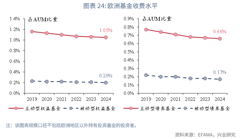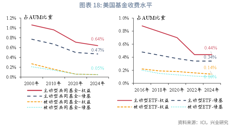 美国共同基金和ETF的平均费用率均呈现下降趋势。2024年,美国主动型共同权益基金费率(0.64%)主动型共同债券基金费率(0.47%)主动型ETF权益基金费率(0.44%)主动型ETF债券基金费率(0.34%)被动型ETF权益基金费率(0.14%)被动型ETF债券基金费率(0.10%)被动型共同权益和债券基金费率(0.05%)。根据ICI报告,投资者不仅仅更加青睐低费率基金类别,而且在同一类别的基金中,也越来越倾向于选择费率更低的基金产品。