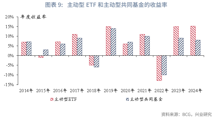 具体到产品来看,主动型共同基金正在将市场让渡给ETF。相较于共同基金,ETF不仅提供了更具吸引力的净费用收益,还具备更优的交易流动性、税率和管理透明度。