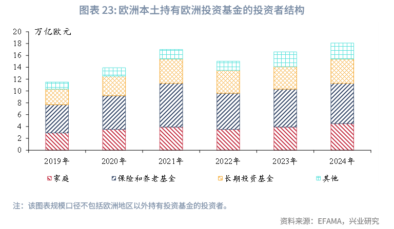 从投资者结构来看,投资基金中家庭投资者的份额继续提升,保险和养老金机构占比进一步萎缩。一方面,由于设立全权委托专户的资金门槛和管理费用通常高于投资基金,大多数家庭投资者更偏好选择投资基金。另一方面,全权委托专户可以更好地实现税务筹划、流动性安排、ESG标的等定制化目标,所以越来越多的保险和养老金资金在成本可控的情况下会优先考虑全权委托专户,导致保险和养老金机构在投资基金中的占比下滑。2024年,家庭、保险和养老金机构在投资基金中分别占24.9%、37.6%,较2022年年末分别提升1.4个百分点、下降1.0个百分点。