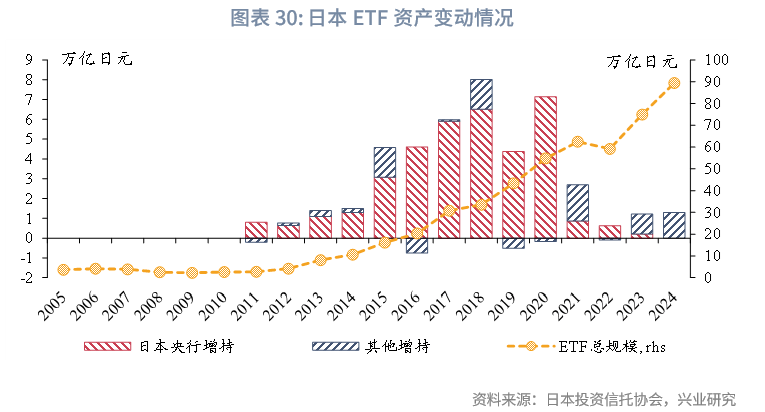 日本央行暂停增持ETF。日本央行自2010年开始大举购买ETF,以提振股市信心对抗通缩,改善企业融资环境。截至2020年,日本央行已成为日本股市最大单一股东,进一步增持对改善市场情绪的作用边际降低。2020年,全球央行大放水推动大类资产价格上涨,企业盈利改善促使外资回流日本股市,使得日本央行托市动力减弱。随后日本央行增持ETF的规模连续衰减。2023年和2024年ETF总规模上涨主要受益于日本国内外市场收益。2024年,日本央行暂停主动增持ETF,未来为避免扭曲资本配置和企业治理,可能维持存量规模并择机逐步减持。