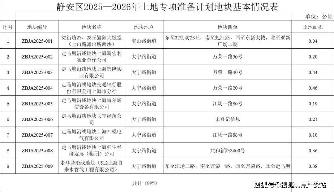 以2025—2026年为研究范本,静安区土地储备共有9宗地块,其中8宗位于大宁,1宗位于宝山路街道。
