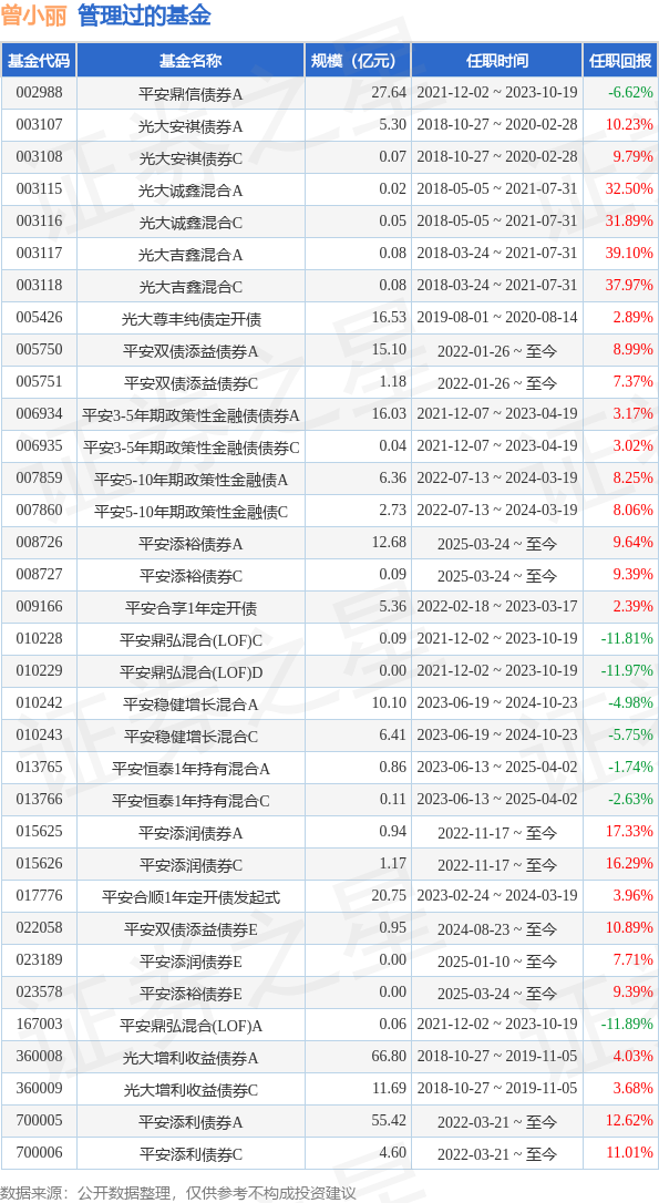曾小丽女士:中国国籍,硕士。2009年获得天津外国语大学国际贸易专业学士学位,2011年获得中国人民大学世界经济专业硕士学位。2011年7月至2014年7月在大公国际资信评估有限公司历任分析师、处经理、技术总监/评审委员;2014年8月加入光大保德信基金管理有限公司,历任信用研究员,现任固收研究负责人一职。曾任光大保德信吉鑫灵活配置混合型证券投资基金基金经理,曾任光大保德信诚鑫灵活配置混合型证券投资基金基金经理,光大保德信增利收益债券型证券投资基金基金经理,历任光大保德信增利收益债券型证券投资基金投资经理、光大保德信尊丰纯债定期开放债券型发起式证券投资基金基金经理。2018年10月27日至2020年2月28日任光大保德信安祺债券型证券投资基金基金经理。2021年8月加入平安基金管理有限公司。2021年12月7日至2023年4月19日担任平安3-5年期政策性金融债债券型证券投资基金基金经理。2022年1月26日任平安双债添益债券型证券投资基金的基金经理。2022年3月21日起担任平安添利债券型证券投资基金基金经理。2022年7月13日至2024年3月19日担任平安5-10年期政策性金融债债券型证券投资基金基金经理。平安添润债券型证券投资基金(2022-11-17至今)基金经理。2023年6月19日至2024年10月23日担任平安稳健增长混合型证券投资基金基金经理。曾任平安鼎信债券型证券投资基金、平安鼎弘混合型证券投资基金(LOF)基金经理、平安合享1年定期开放债券型发起式证券投资基金基金经理。现任平安添裕债券型证券投资基金基金经理。曾任平安恒泰1年持有期混合型证券投资基金基金经理。