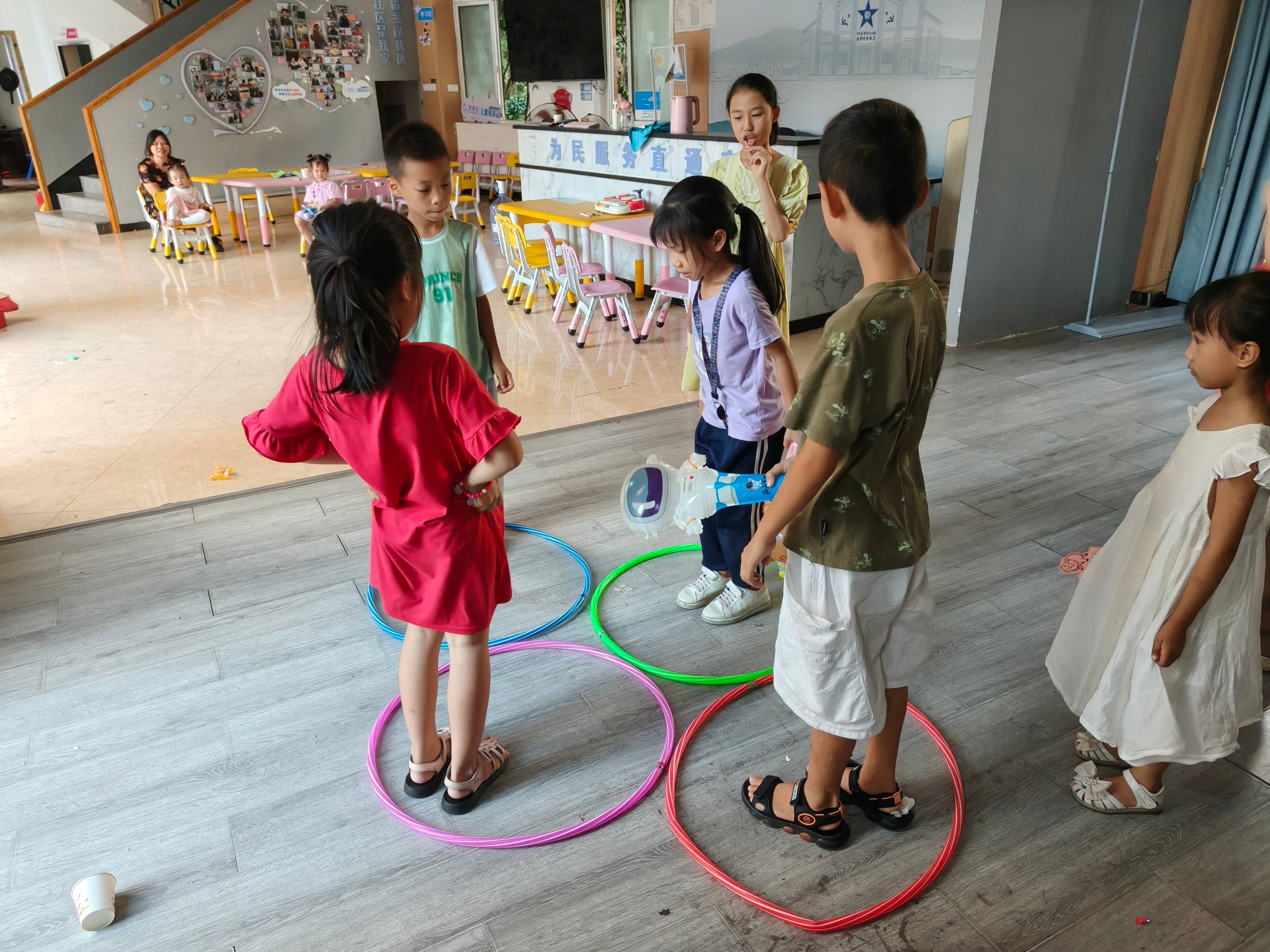 折纸结束后,志愿者引导孩子们进入呼啦圈游戏。首先,志愿者介绍了游戏规则,游戏名称叫“内外左右跳呼啦圈”每组四人竞争,志愿者在一旁当裁判,过程非常激烈,孩子们就在欢声笑语中完成了呼啦圈趣味游戏,锻炼了身体协调性和灵活性,还让孩子们在玩乐中学会规则和竞争。