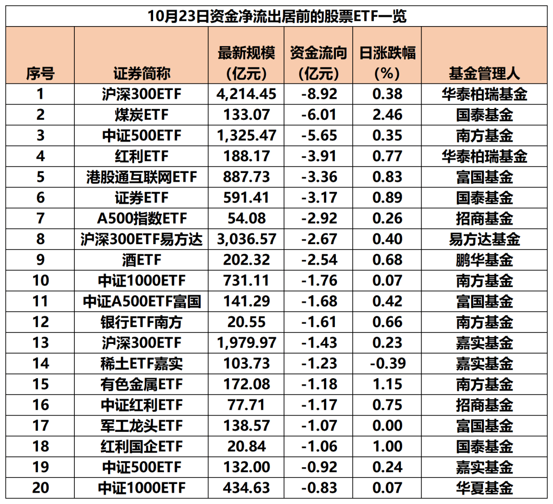 从单日资金净流出排行看,沪深300ETF、中证500ETF、A500指数ETF等宽基ETF产品成为“失血”大户。煤炭ETF、红利ETF、港股通互联网ETF、证券ETF等热门主题ETF产品也资金净流出居前。