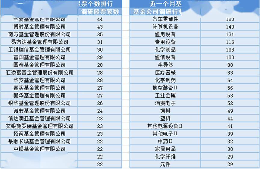 近一个月(12月9日-1月8日),华夏基金参与公司调研的数量最多,共调研44家上市公司,此外调研较为活跃的还有博时基金、南方基金和易方达基金,分别调研43家、35家、31家上市公司;从调研行业上来看,基金公司对汽车零部件行业的上市公司调研次数最多,共有160次,其次是计算机设备行业,基金公司调研了140次。