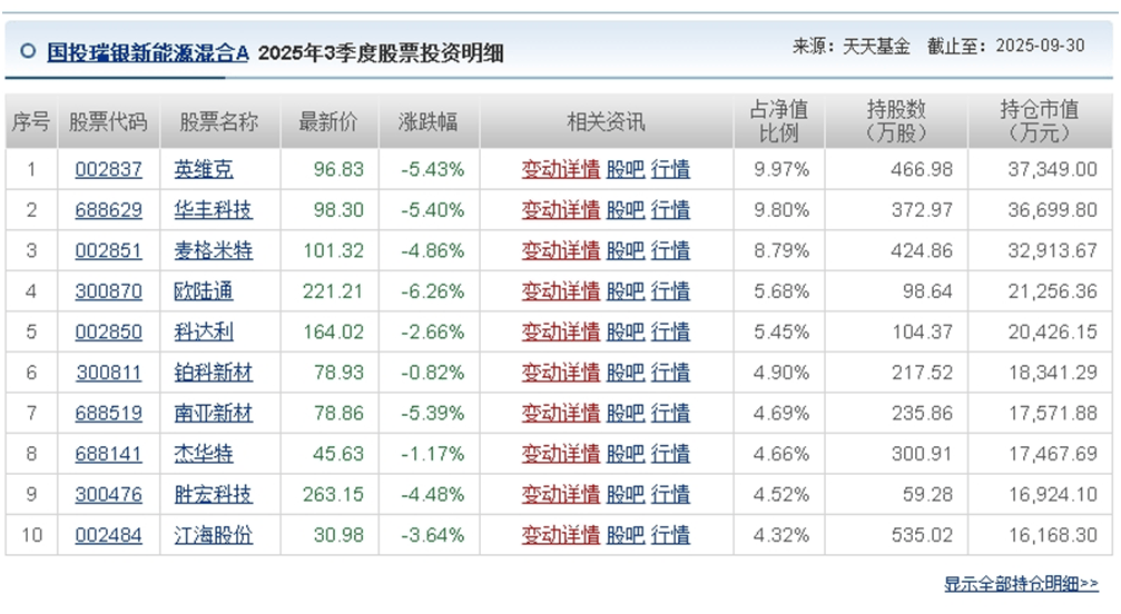 截至2025年三季度末,国投瑞银新能源混合前十大重仓股分别为英维克、华丰科技、麦格米特、欧陆通、科达利、铂科新材、南亚新材、杰华特、胜宏科技、江海股份,其中欧陆通、南亚新材、胜宏科技为当季新进重仓股。