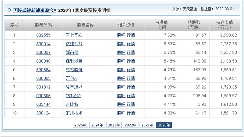 但Wind数据与季报显示,该基金多次偏离主题:2020年一季度末,前十大重仓股中保利发展、万科A等地产股,三七互娱等互联网游戏股合计占比近26%,意味着新能源相关持仓不足80%。