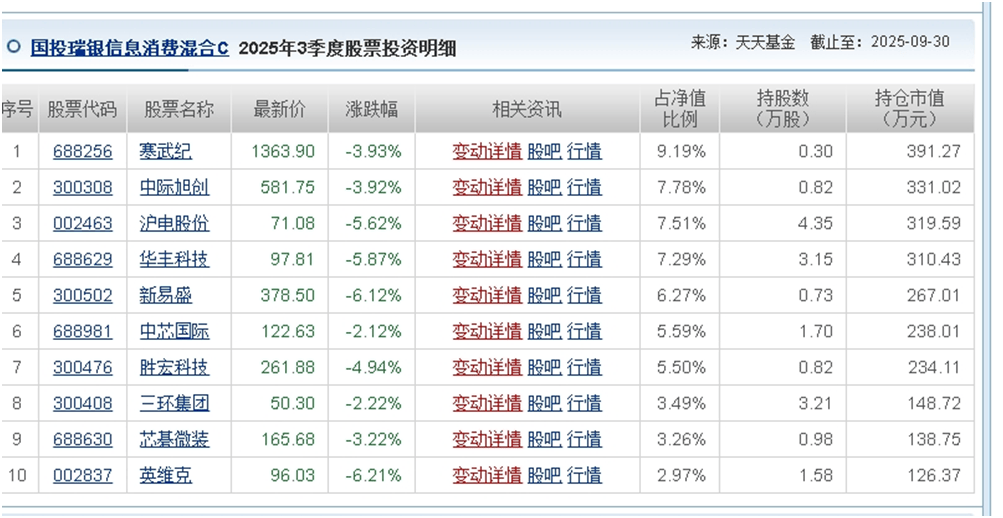 值得注意的是,国投瑞银的风格漂移并非个例。基金经理马柯管理的国投瑞银信息消费混合,2024年二、三季度因“风格漂移”被济安金信不予评级,该基金约定信息消费主题资产投资比例不低于80%,但2025年三季报前十大重仓股均为AI、半导体类科技股,且与马柯管理的另一只基金重仓股完全一致,仅持仓比例不同。