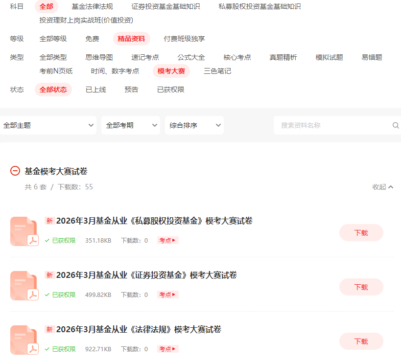 目前3月基金从业资格模考大赛已经结束,如果大家还想再次模考,可以下载本次模考大赛PDF版试卷进行估分,方法如下: