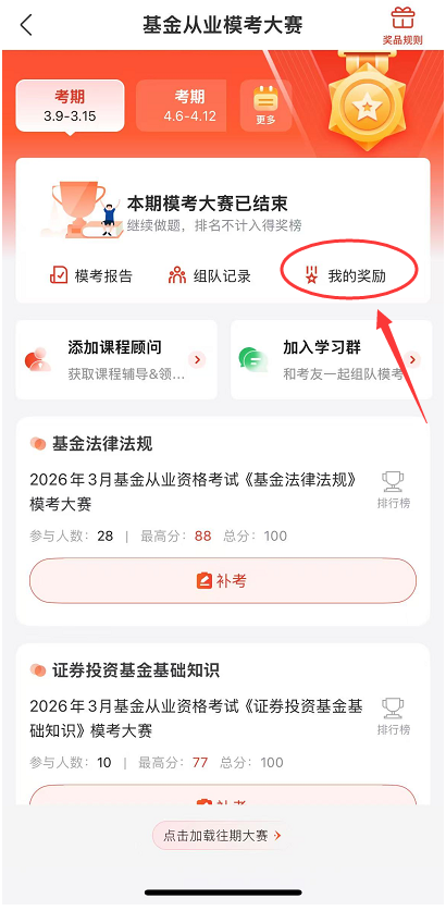 本次基金从业资格考试模考大赛奖品有233网校笔记本套餐、7天V1题库会员体验版、考证币、下载币等,以下奖品仅公布前三名,其他考试合格者可获得30个下载币,可通过【我的】—【我的资料包】查看。ps:分数相同的情况下按答题顺序进行排名,科目三无获奖者。
