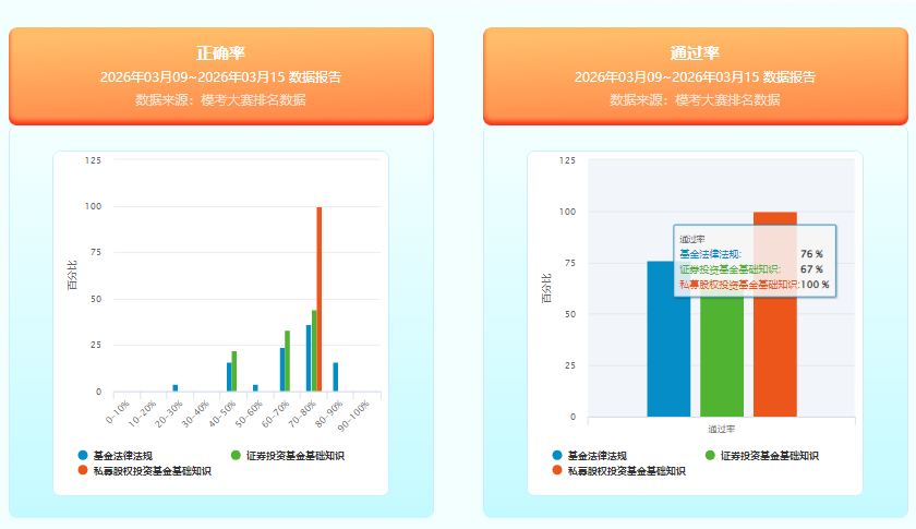 本次基金从业资格模考大赛中,法律法规通过率相对较高,占比76%,证券投资基金通过率为67%;从正确率来看,证券投资基金60-70分达到了33%,其次基金法律法规24%,具体情况如下表:(PS,私募参与人数过少,不作参考)