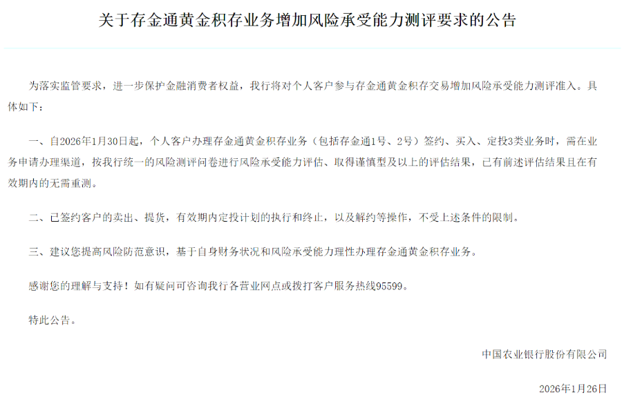 农业银行也发布公告,自2026年1月30日起,办理存金通黄金积存业务的签约、买入、定投,需通过风险测评取得“谨慎型”及以上结果。