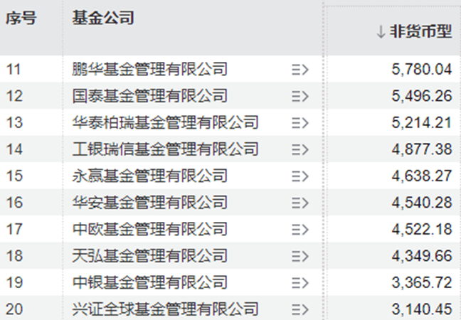 鹏华基金以5780.04亿元的非货规模位列第11名,紧随前十强之后,展现出较强的市场竞争力。国泰基金以5496.26亿元位居第12名,与鹏华基金差距较小。