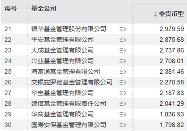 兴业基金、海富通基金、交银施罗德基金以及华宝基金分别位列第24至第27名,规模均在2100亿元至2800亿元之间,形成了中游集团的密集竞争态势。