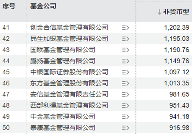 在41名至50名的区间,基金公司的非货规模竞争进入了最为胶着的“贴身肉搏”阶段。