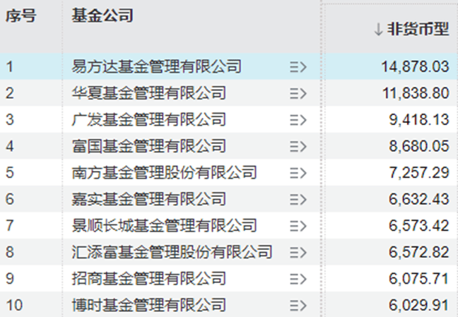从最核心的头部阵营来看,非货规模排名前十机构依次为:易方达基金、华夏基金、广发基金、富国基金、南方基金、嘉实基金、景顺长城基金、汇添富基金、招商基金以及博时基金。